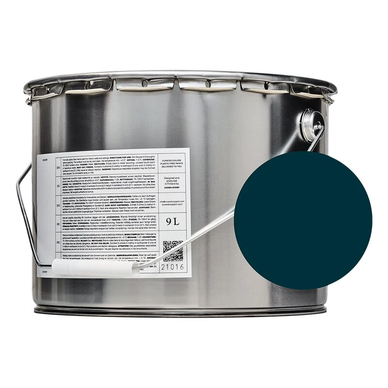 Cover Story’s interior paint in the shade i04 Olavi is a dark navy blue with petrol undertones that make it the perfect pair for colder hues – but also the ideal counterpart for warm whites. In terms of furniture, the mystical blue hue complements darker wood tones and patinated surfaces. Part of the Cover Story x Iittala capsule collection, the paint is inspired by Iittala’s extensive glass colour archive: Olavi’s striking hue is Cover Story’s interpretation of Iittala’s blue-coloured glass.