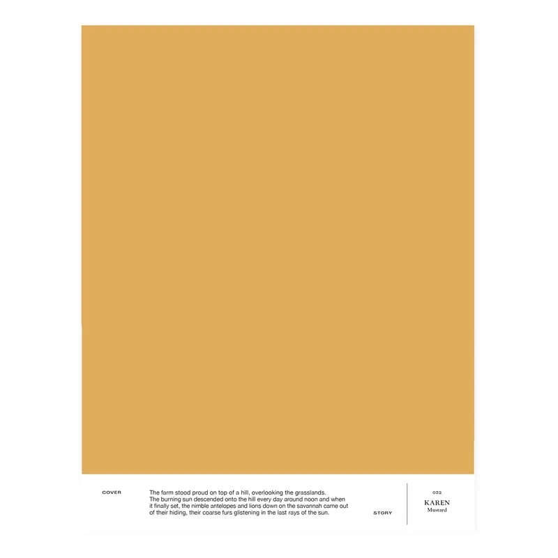 Cover Story’s interior paint in the shade 032 Karen is the perfect mustard paint whose yellow-brown tone recalls the cosy atmosphere of old wooden houses. The spicy tone also adds a lovely contrast to modern decors. The paint has a matte finish that provides a velvety smooth, non-reflective surface.