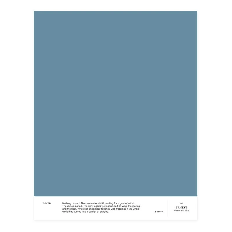 Cover Story’s interior paint in the shade 018 Ernest is a beautifully atmospheric blue paint that creates the perfect backdrop for designer furniture and especially a mid-century modern décor. Ernest has a flat sheen that provides a matte, non-reflective finish on the painted surface.