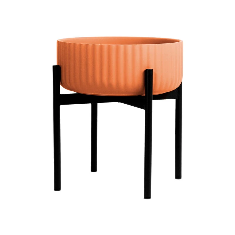 Elementa’s Klorofyll plant stand consists of a shallow flowerpot and a minimalist base that together provide an elegant setting for a variety of houseplants. The terracotta-coloured pot is made of pigmented concrete and the simple geometric stand is made of black powder-coated metal.