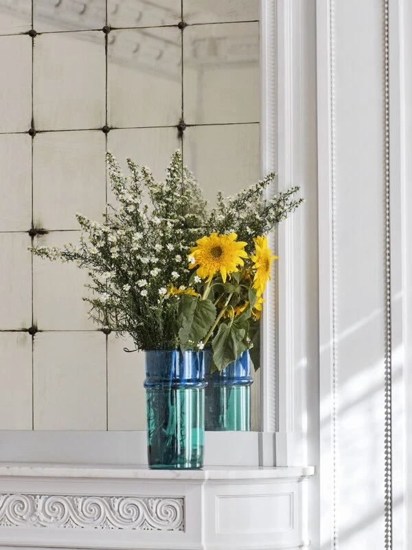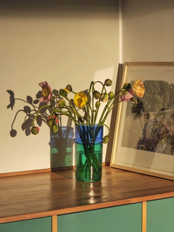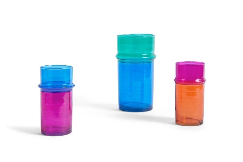 HAY’s Moroccan vase gives an extra pop of colour for flower bouquets and branches. Featuring a cylinder shape with a thicker ring on its side, the vase plays with the contrasts of boldly coloured glass surfaces. The vase has been mouth-blown in Morocco from recycled glass.