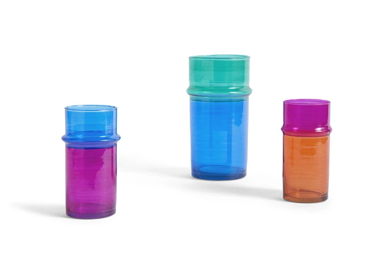 HAY’s Moroccan vase gives an extra pop of colour for flower bouquets and branches. Featuring a cylinder shape with a thicker ring on its side, the vase plays with the contrasts of boldly coloured glass surfaces. The vase has been mouth-blown in Morocco from recycled glass.