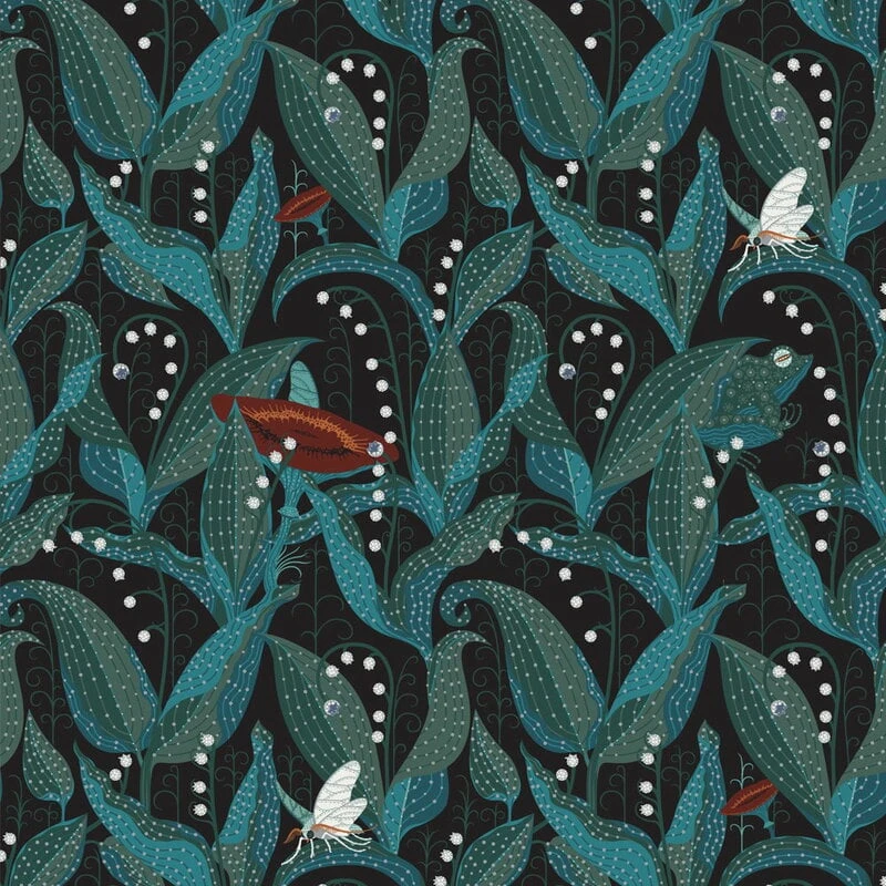 Klaus Haapaniemi’s Lily of the Valley wallpaper features an art deco-inspired pattern of delicate flowers, butterflies and little frogs hiding in the leaves. Klaus Haapaniemi, one of the leading names of contemporary Finnish design, has designed a wallpaper collection full of intense colours and bold patterns inspired by Nordic nature and mysticism.