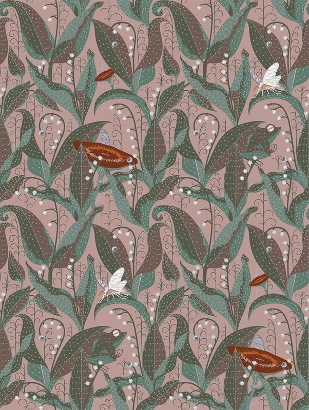 Klaus Haapaniemi’s Lily of the Valley wallpaper features an art deco inspired pattern of delicate flowers, butterflies and little frogs hiding in the leaves. Klaus Haapaniemi, one of the leading names of contemporary Finnish design, has designed a wallpaper collection full of intense colours and bold patterns inspired by Nordic nature and mysticism.
