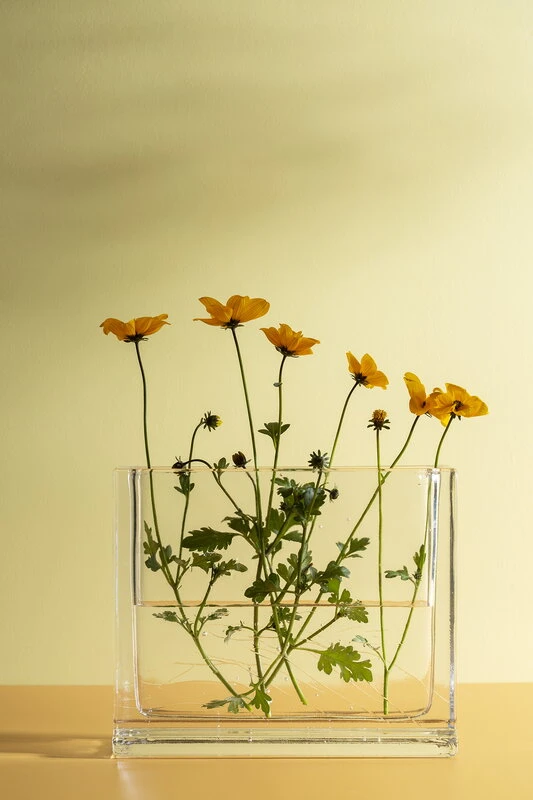 According to Torbjørn Anderssen and Espen Voll, the inspiration for the Monoblokk vase came from glass panels, aquariums and concrete road dividers. The wide and narrow shape provides support and an attractive frame for flowers and decorative branches, and when left empty, the Monoblokk vase can function as a minimalist glass sculpture.